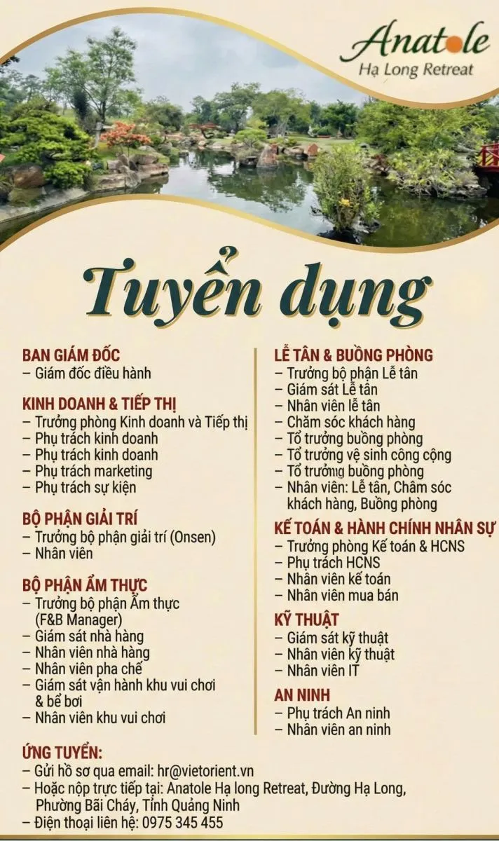 Join the team operating a world-class resort in Bai Chay – Quang Ninh! Anatole Ha Long Retreat is seeking enthusiastic and professional candidates to join us during the pre-operation phase. We are recruiting for multiple positions across various departments: