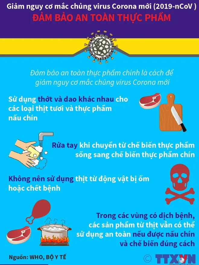 Nấu chín kỹ thức ăn từ thịt và trứng. Không sử dụng thịt từ động vật bị ốm hoặc chết bệnh. Sử dụng thớt và dao khác nhau cho các loại thịt tươi và thực phẩm nấu chín và Không tiếp xúc với động vật hoang dã hoặc vật nuôi mà không có độ phòng hộ.