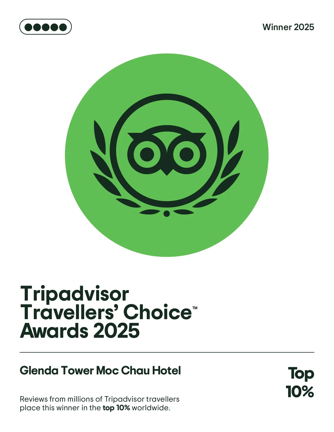 Mộc Châu, Sơn La - Tháng 5 năm 2025 - Khách sạn Glenda Tower Mộc Châu, được quản lý bởi Công ty quản lý khách sạn chuyên nghiệp Viet Orient Hospitality, rất vinh dự khi được nhận Giải thưởng Travelers’ Choice® 2025 của Tripadvisor®. Đây là giải thưởng dành cho những đơn vị nằm trong top 10% cơ sở lưu trú được đánh giá cao nhất trên toàn thế giới trên Tripadvisor.