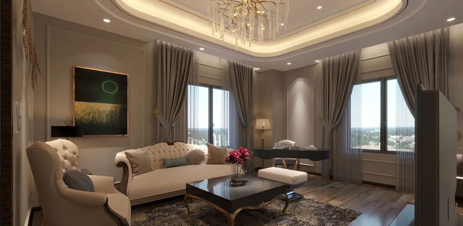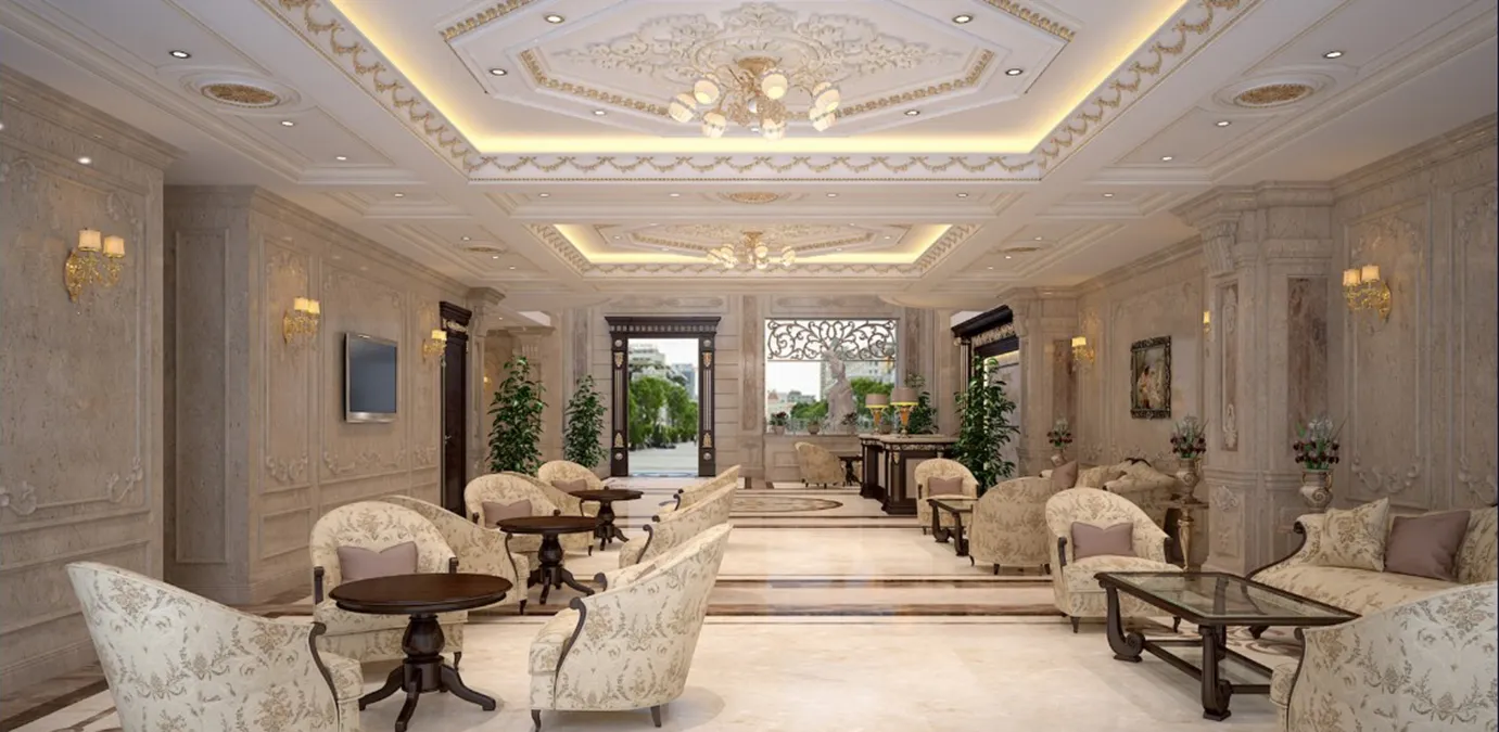 Located right in the heart of Bac Ninh city, the hotel features a neoclassical design. The exterior is paved with white granite, while the interior boasts a spacious lobby with high ceilings that maximize natural light, creating an airy yet luxurious atmosphere.